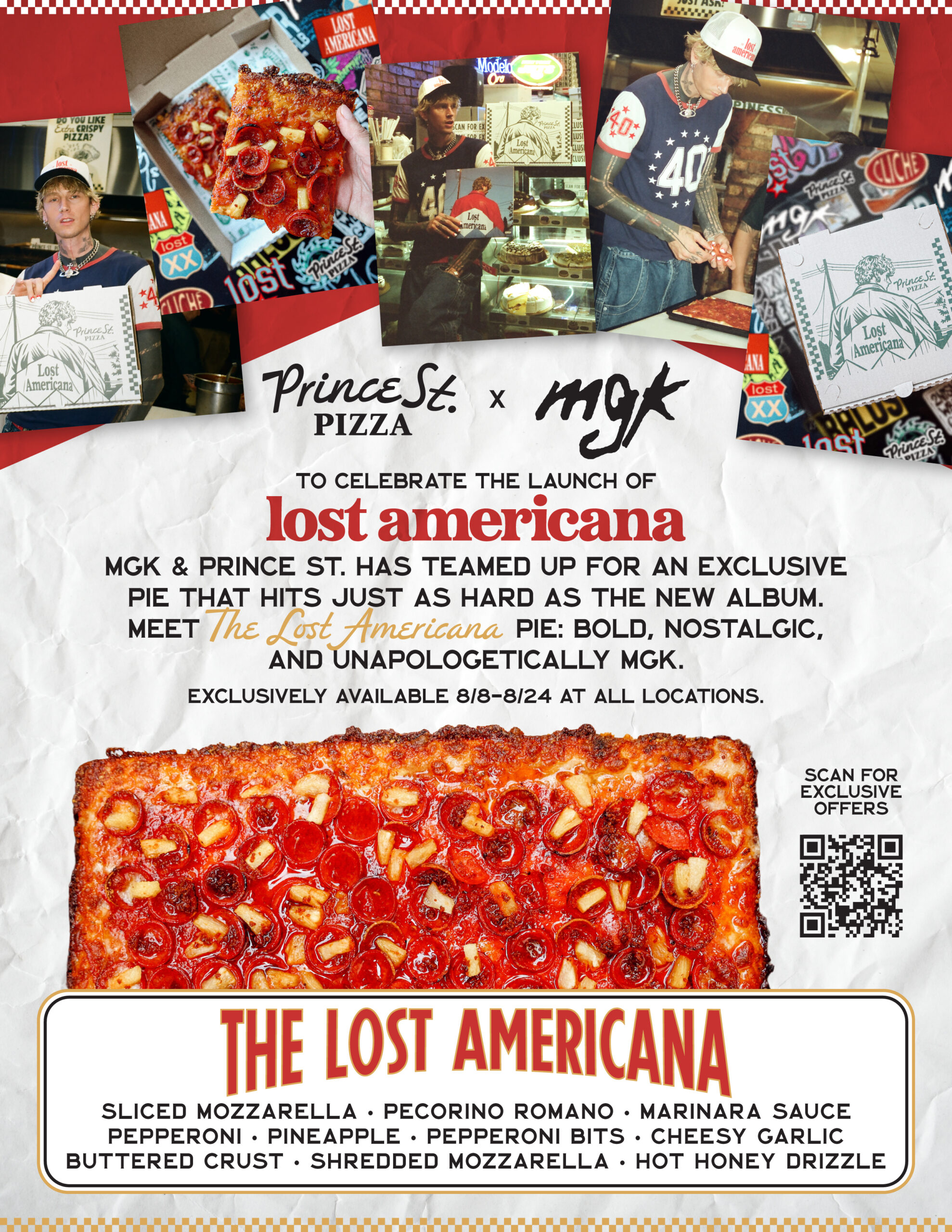 Prince Street Pizza and Machine Gun Kelly have teamed up to create an exclusive pie in honor of his new album! Enjoy “The Lost Americana” here at the Shoppes now through 8/24.